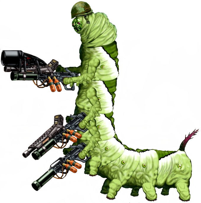 The Caterfighter is a large, green, helmet-wearing caterpillar-like creature with three sets of arms. Each set of arms has a different weapon in a similar manner to a Gunstack.