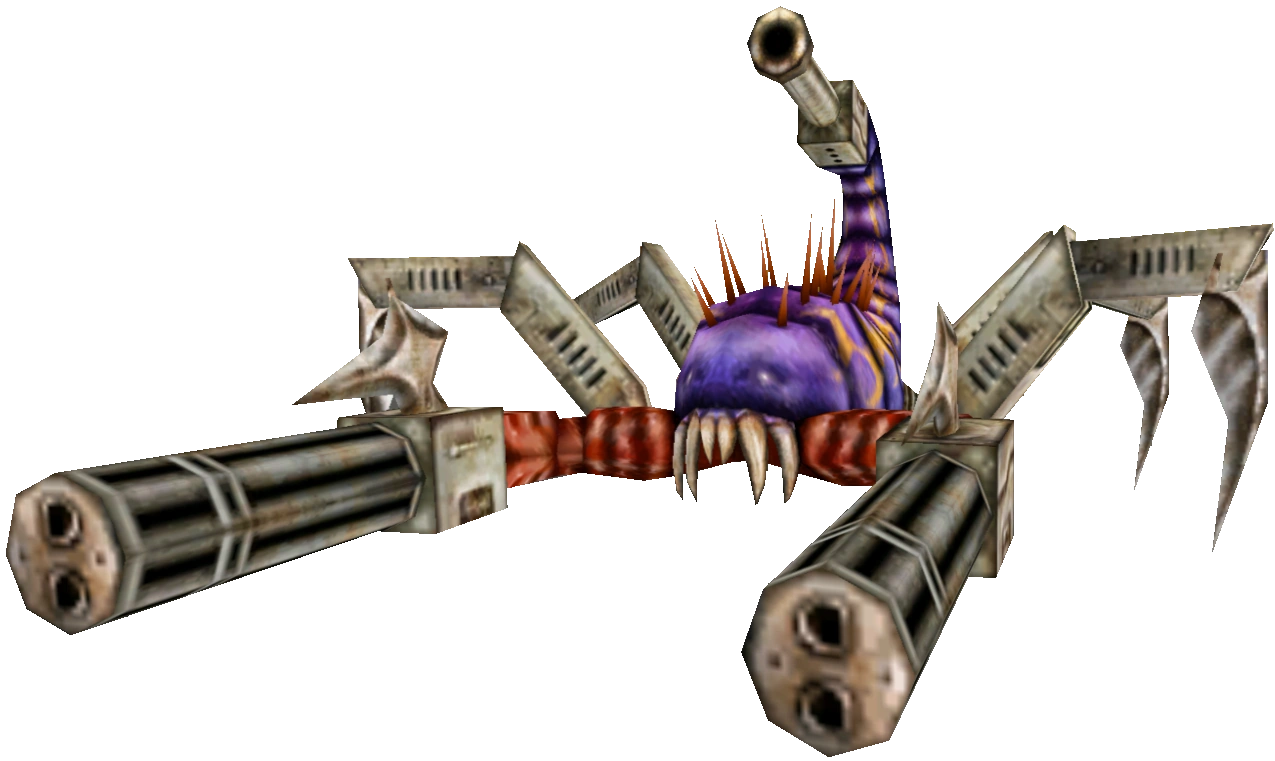 Normally, the Mecha-Arachnoid will fire miniguns, but will occasionally switch to firing a powerful blue laser from its tail. The bullets from the minigun have excellent range, but the miniguns themselves will become less accurate the farther away the target is from the Mecha-Arachnoid. If someone gets close to it, it will smack the target from with the side of its miniguns.