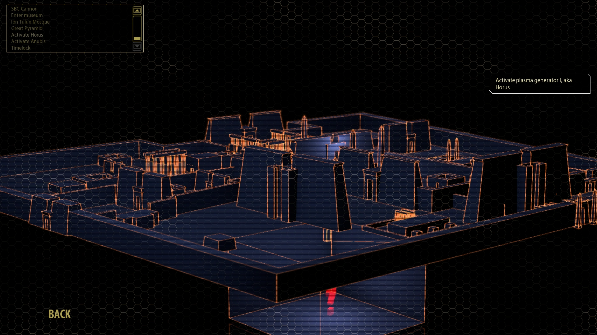 NETRICSA does not provide large blocks of texts regarding locations. Instead, NETRICSA will show off a 3D map of an objective and any interesting points regarding the location. These points are brief and generally instruct Sam where to go, along with a historical fact or two to help him understand what he's getting into. When Sam is first told of a new location he must go to, NETRICSA will show a small 3D map of the location the lower left-hand corner of the screen. This is the same map that NETRICSA will show if Sam brings it up while in NETRICSA's databanks.