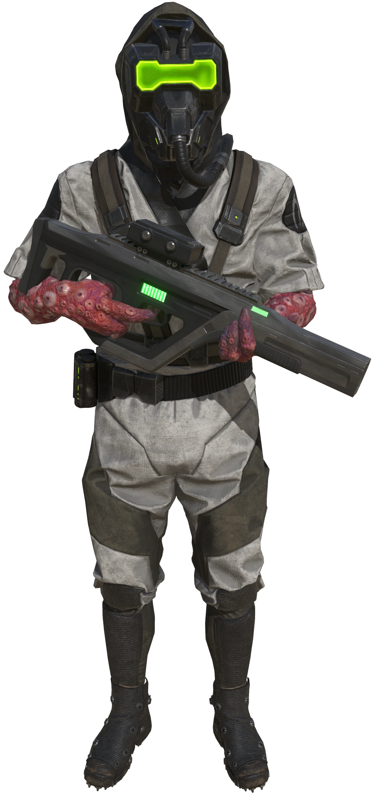 Like other Octanian soldiers, Gamma Troopers are equipped with standard-issue body armor, which provides them with moderate to substantial protection in combat. They also wear respirators and goggles to help them survive Earth's environment.