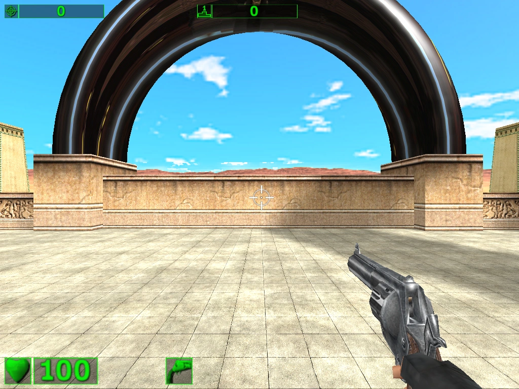 The player is warped into a large, outdoor area with a temple on each side and is only armed with a Military Knife and Schofield .45. The design of the temples depends on the game the Technology Test is in. In The First Encounter, it is Egypt-themed, while The Second Encounter version is Mayan-themed. Each temple has different special effects to test if the player's computer can run them. The temples are surrounded by either a never-ending desert or grass field.